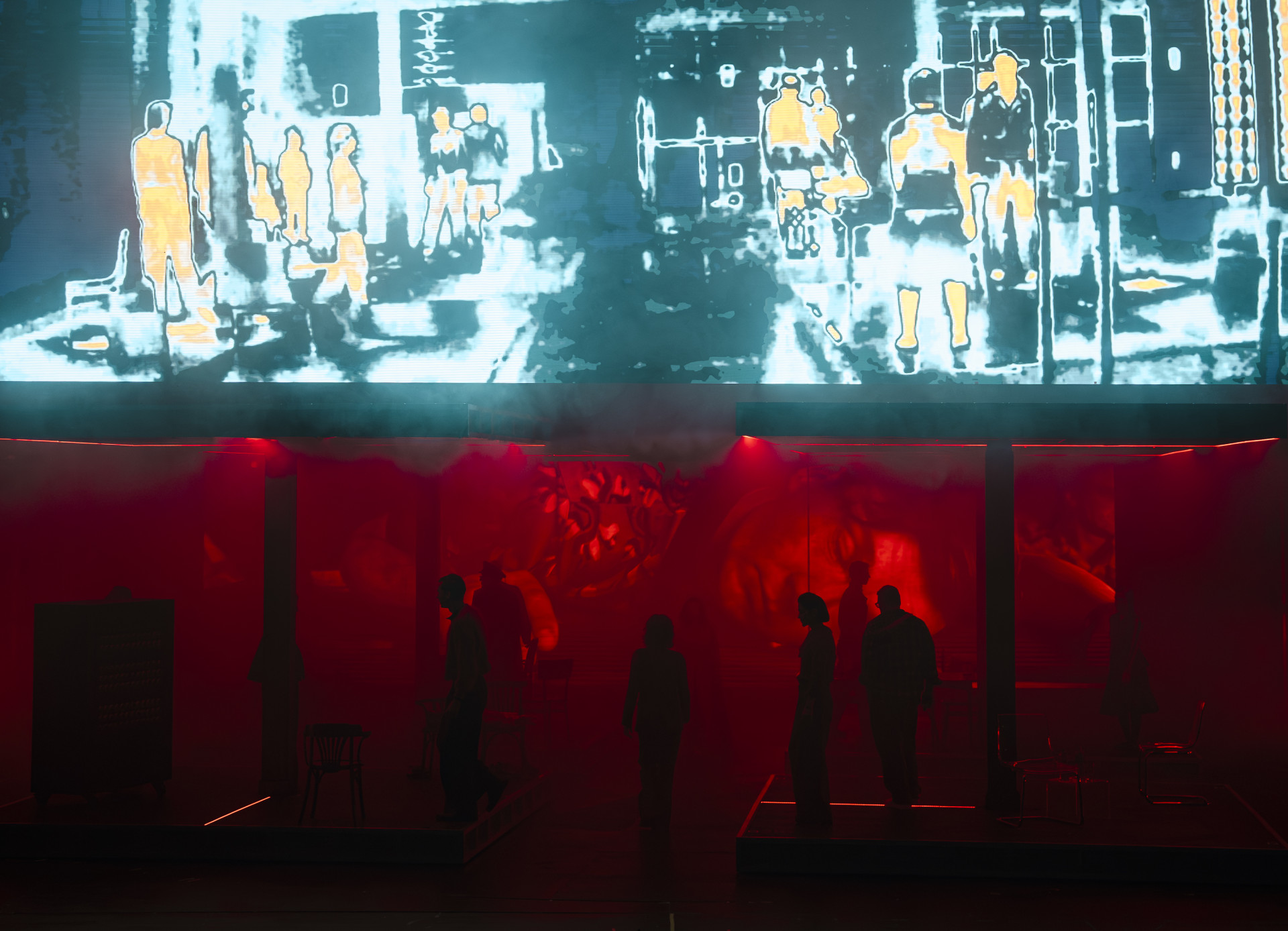 Izrādes laikā uz skatuves līdz ar aktieriem uzvedumu veido arī vairāki video operatori, kas to tver tiešraides translācijās un kino manierei raksturīgos paņēmienos. Izrāde ir ne tikai vizuāli vērienīga – tā katru vakaru pie skatītājiem nokļūst, pateicoties arī iespaidīgam tehnisko darbinieku personālam, kas nodrošina gan izrādes vizuāli krāšņo un mainīgo scenogrāfiju, gan jaudīgo skanējumu. Izrādes tehniskā un radošā komanda apvieno gandrīz 40 cilvēku.