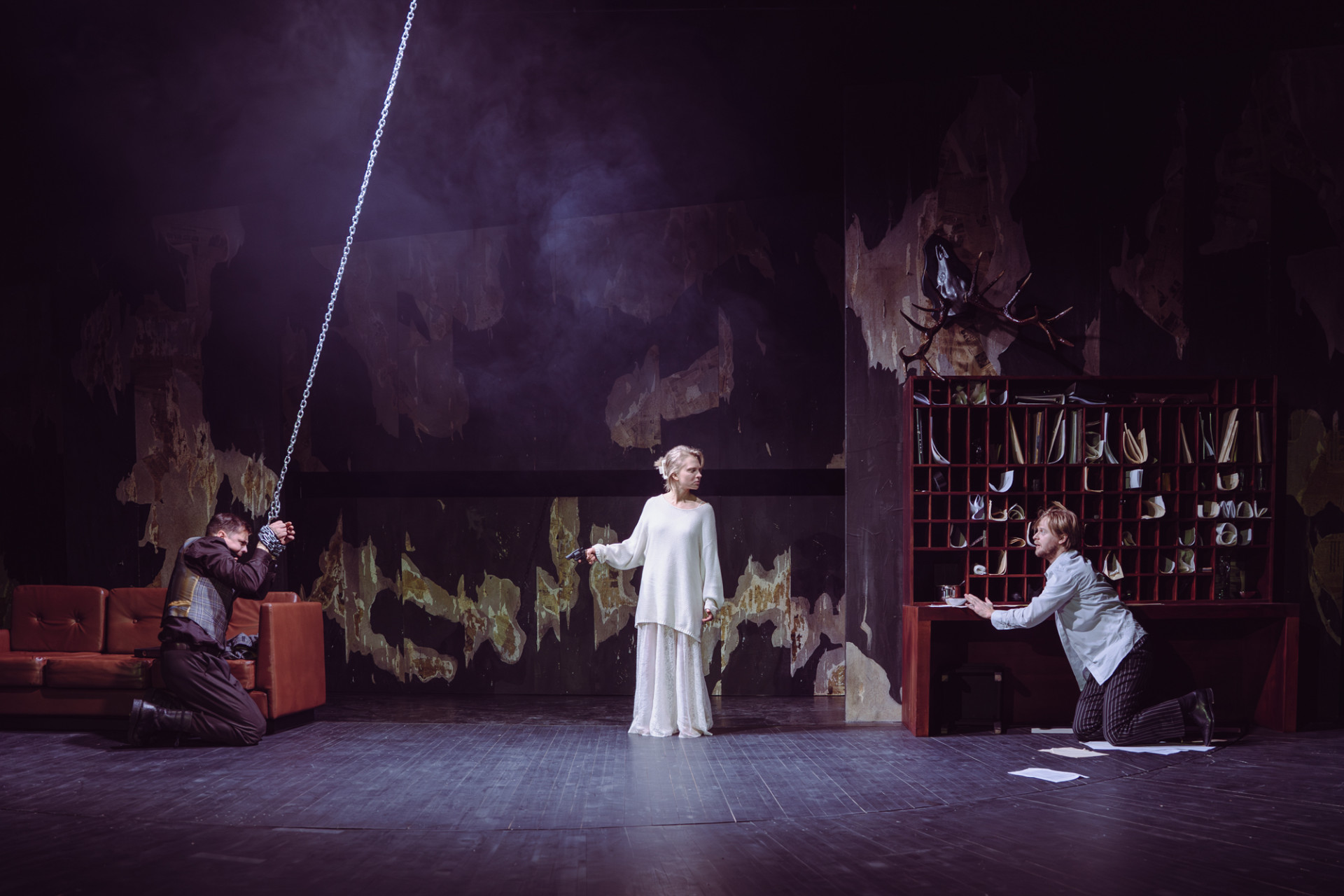Galvenās lomas izrādē atveido trīs aktieri – Madara Viļčuka, Toms Veličko un Gints Andžāns.